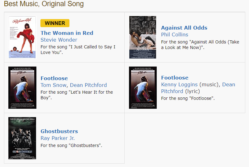 While researching a future post today, I realized that not only did “Purple Rain” (or literally any other song from Purple Rain) not win Best Original Song in 1984, it WASN’T EVEN NOMINATED. Prince did win the award for Best Song Score, but the fact that none of the individual songs were nominated is incomprehensible. And yes, “I Just Called to Say I Love You” really is that terrible.