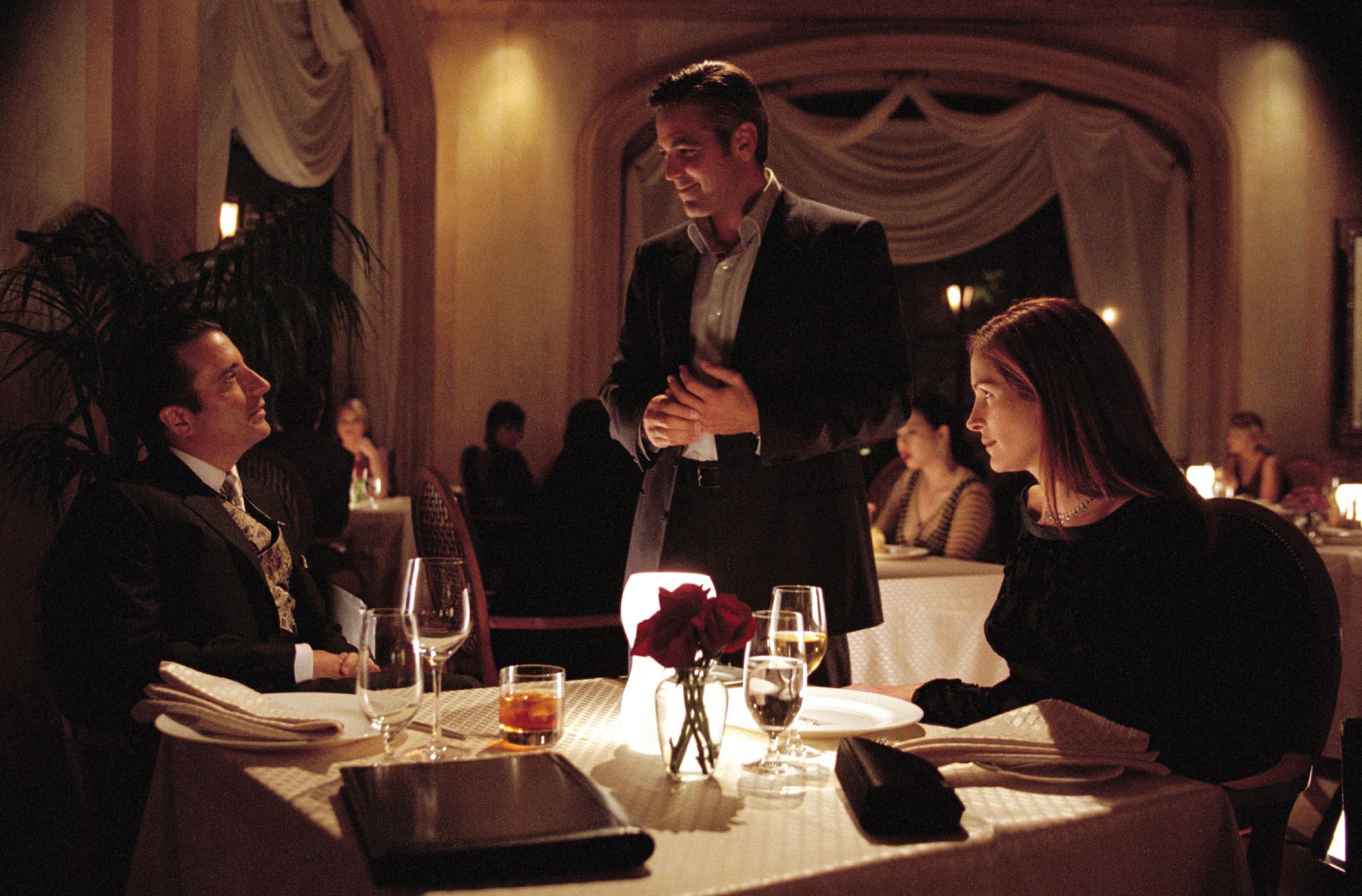 The main character outside of “The Eleven” is Tess Ocean, Danny’s ex-wife and the current girlfriend of casino owner Terry Benedict (Andy Garcia). Benedict is Danny’s target, but Danny has neglected to divulge Benedict’s relationship status to the rest of the team. Tess is played by Julia Roberts, whose chemistry with Clooney is off-the-charts. Surprisingly, Roberts and Clooney had never met in real life, but George was certain Roberts was the right person for the role. Having just become the first woman to command $20 million for a movie (for Erin Brockovich), Roberts was charmed by Clooney, who sent her a $20 bill along with a note that said “I heard you’re getting 20 a picture”.