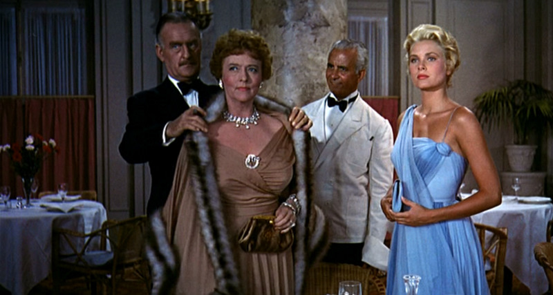 Kelly’s next collaboration with Hitchcock, Rear Window, is one of Hitch’s best and Kelly is perfect as Lisa Fremont, socialite girlfriend to photographer LB “Jeff” Jeffries (James Stewart), who is laid up in his Greenwich Village apartment with a broken leg. To pass the time, Jeff spies on his neighbors through his courtyard window and becomes obsessed with the notion that one of them has murdered his wife. Initially, Lisa is skeptical, but eventually comes around, even participating in the investigation by climbing up the fire escape and breaking into the neighbor’s apartment. One of my favorite shots in any movie is Lisa pointing to her finger, on which she has placed the missing wife’s wedding ring.