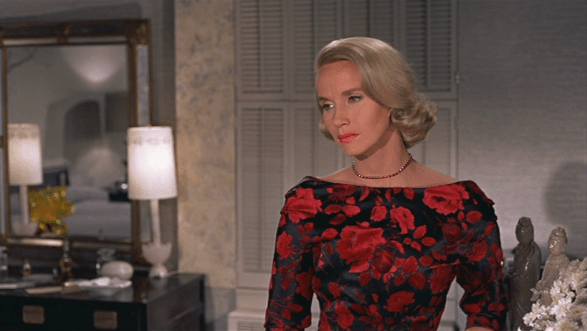 For his next film, North by Northwest, Hitchcock hired another beautiful blonde, Eva Marie Saint. Saint plays Eve Kendall, who meets Cary Grant’s Roger Thornhill on a train. Thornhill, in a case of mistaken identity, is on the run from thugs who think he’s a spy (he’s actually an advertising exec). And because this is a Hitchcock film, once again the beautiful blonde is not who she says she is. Northby Northwest features some of Hitch’s most iconic set pieces – the UN General Assembly, a crop dusting plane over a cornfield, Mount Rushmore – but those are mere backdrops to Kendall’s icy beauty.