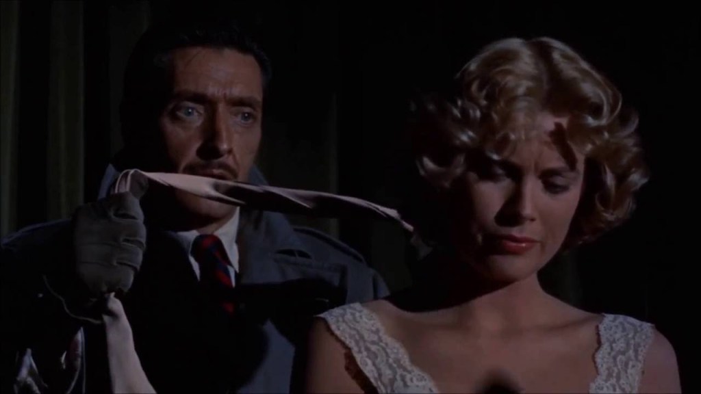 In Dial M for Murder, Grace Kelly’s first of three Hitchcock films, Kelly plays a wealthy socialite named Margot whose husband discovers she has had an affair and arranges to have her murdered. The hit goes awry, the hitman ends up dead and Margot winds up in prison. The assault scene supposedly took five days to film and left Kelly covered in bruises. Hitchcock, enamored of (obsessed with?) Kelly’s combination of “frigidity and lust”, would cast her in his next two films, and would even attempt to coax her out of retirement ten years later to play Marnie; Tippi Hedren would wind up with the role – more on that in a bit.